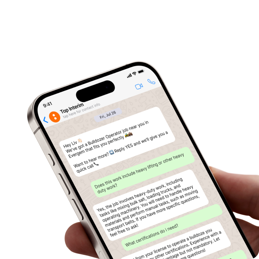 Taloo answers questions, guides applications, and supports candidates around the clock — via WhatsApp, email, or chat.